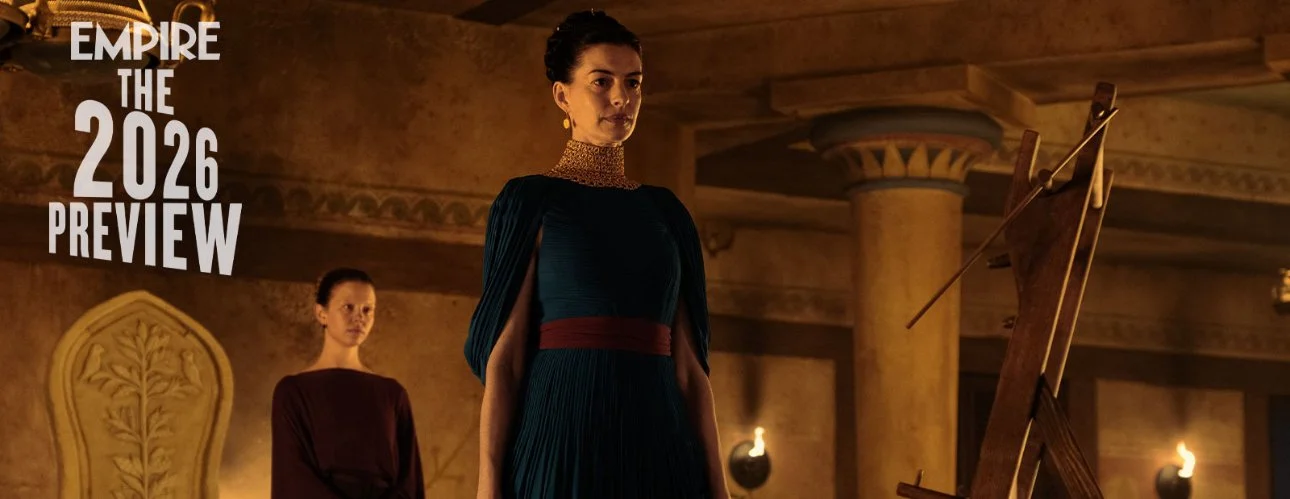 We have Anne Hathaway as Penelope, Odysseus’ wife, with Mia Goth’s Melantho, one of the maids in the palace, lurking in the background.