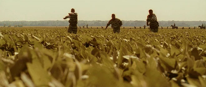 This classic from 2007 is one of the last features Deakins shot on film, ever since then he has made the full transition to digital film. It’s hard to pick just one image from Andrew Dominik’s masterpiece as it is one of the most beautifully photographed movies of the 21st century, the train station shadow/smoke scene is one other iconic moment that comes to mind, but for my money nothing beats this gorgeous frame in which Brad Pitt’s Jesse James look over the sunset as he contemplates his next move. It’s an eerie, evocative shot that once again shows just how great Deakins can shoot the first sunrise of the day (cue Sicario for another great moment of the sunset)