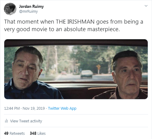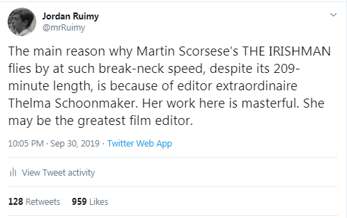 “Despite clocking in at close to 3 and a half hours, "The Irishman" never feels slow or out-of-breath, which is a testament to Thelma Schoonmaker's exquisite editing, juggling all the timelines together in ways that never let up — this is a high-wire act of editing from a legendary woman responsible for the greatest edited movie of all-time (Raging Bull). And yet, Scorsese, no slouch himself, shoots the film in magisterial ways, inspired, much like he was in his last feature, “Silence,” by a Bresson-ian brand of cinema: the ellipses, the minor use of music (a simple, yearnful harmonica drives the score home), and more intriguingly, the somber minimalism in both the acting and directing. De Niro and Pesci are so good that their work here can easily be dismissed in favor of Pacino’s more showy performance, but don’t be fooled, these are all masters working at the top of their craft.”