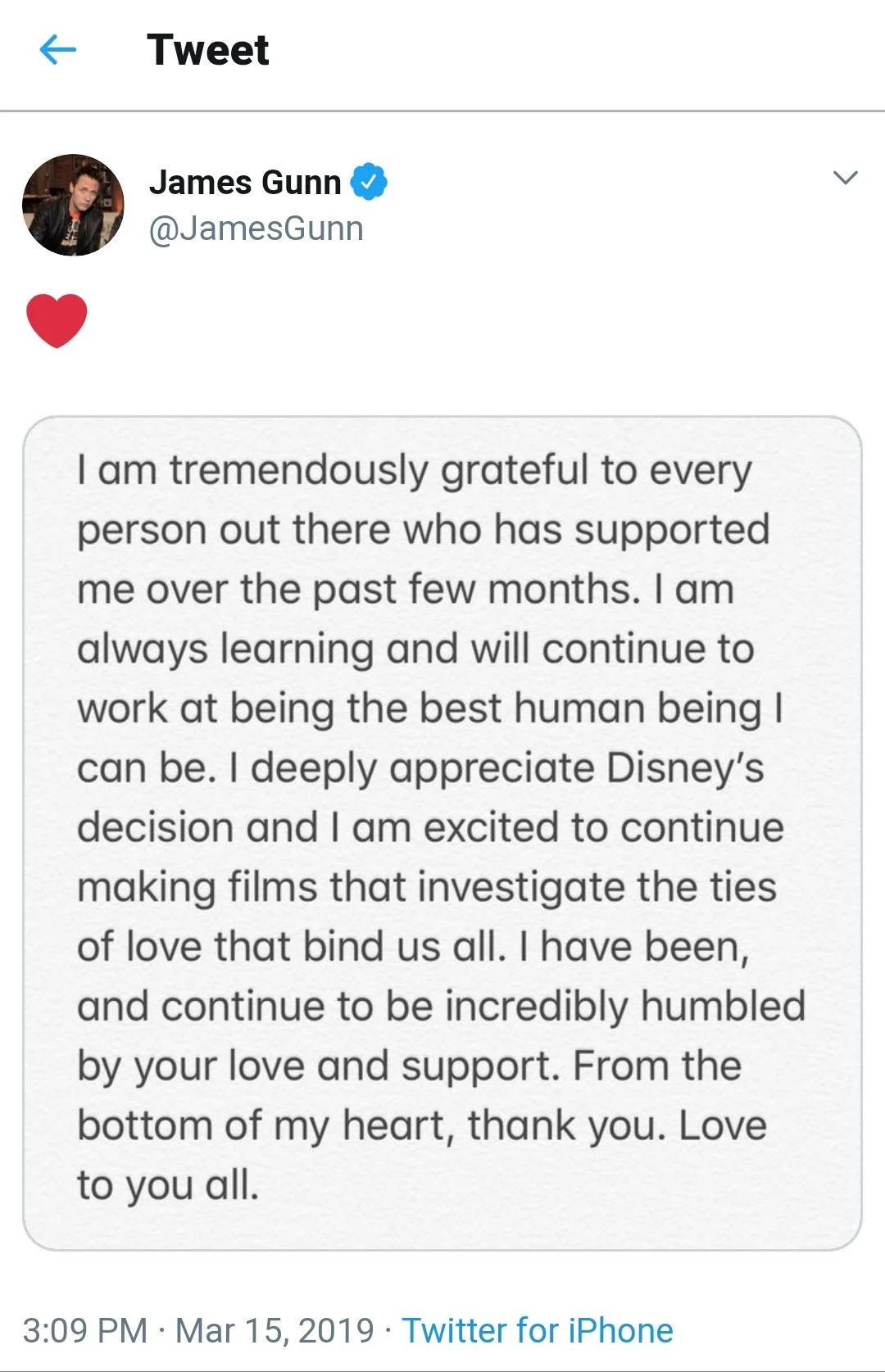 James Gunn had been fired, in July of 2018, by Disney and Marvel after old, offensive tweets from the filmmaker resurfaced on Twitter. However, in a remarkable turn of events, Disney has decided to reinstate Gunn as the director of “Guardians of the Galaxy Vol. 3.” Variety is reporting that the sudden rehiring of Gunn happened “after a series of meetings with Walt Disney Pictures honcho Alan Horn.”