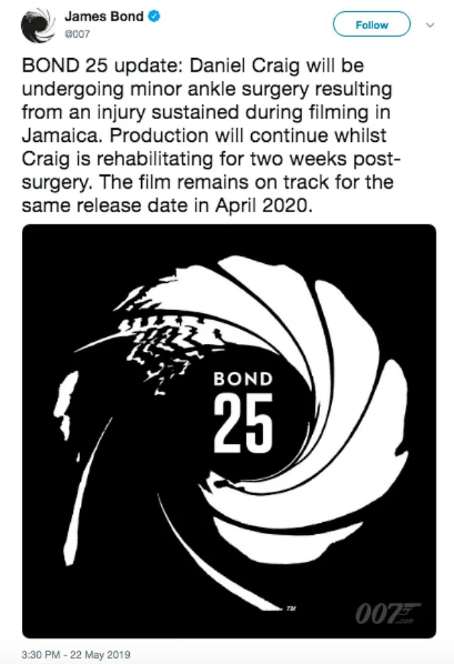 “Daniel Craig will be undergoing minor ankle surgery resulting from an injury sustained during filming in Jamaica. Production will continue whilst Craig is rehabilitating for two weeks post-surgery. The film remains on track for the same release date in April 2020.”