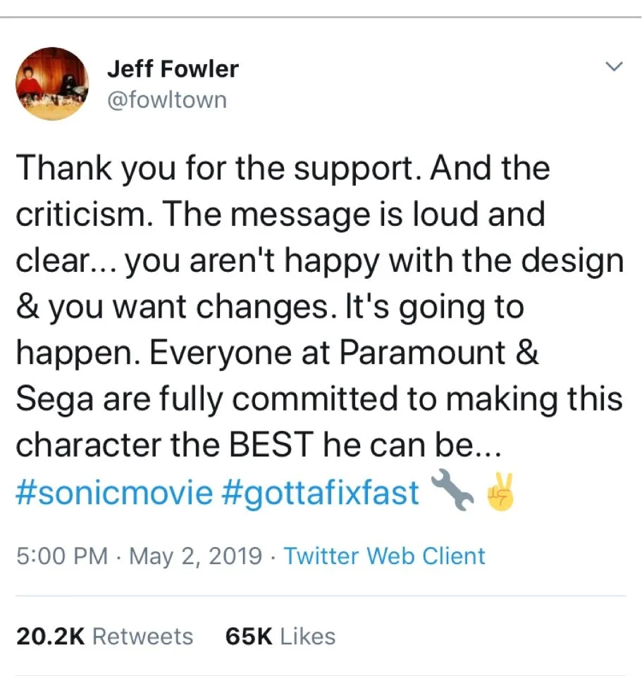 “Thank you for the support. And the criticism,” Fowler wrote in a tweet. “The message is loud and clear… you aren’t happy with the design & you want changes. It’s going to happen. Everyone at Paramount & Sega are fully committed to making this character the BEST he can be…”