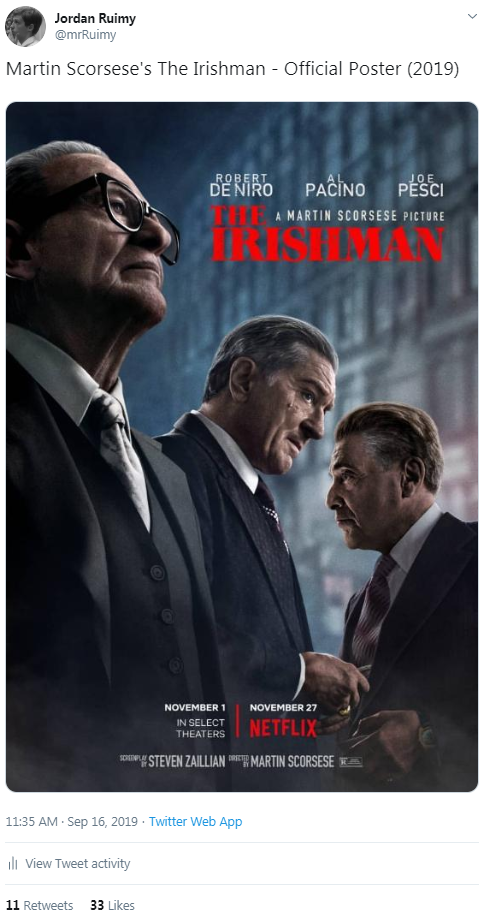 Can’t really complain about a poster that says it’s a “Martin Scorsese Picture” and features classic mob poses from Joe Pesci, Robert De Niro and Al Pacino. Can’t wait to see this next Friday.
