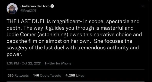 It’s nice to see Guillermo del Toro giving his stamp of approval to Ridley Scott’s already under-appreciated “The Last Duel.” I still stand by my belief that if enough Oscar voters watch this movie then Ben Affleck, Jodie Comer and the film itself have a chance at getting nominated.
