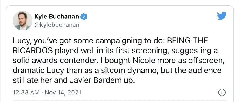 “Aaron Sorkin’s “Being The Ricardos” is significantly better than expected. I was expecting “slick & good enough”; in fact it’s smooth, grade-A, crisply written & very impressively acted (especially by Nicole Kidman, who captures Lucille Ball’s voice, Javier Bardem & JK Simmons).”