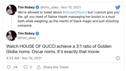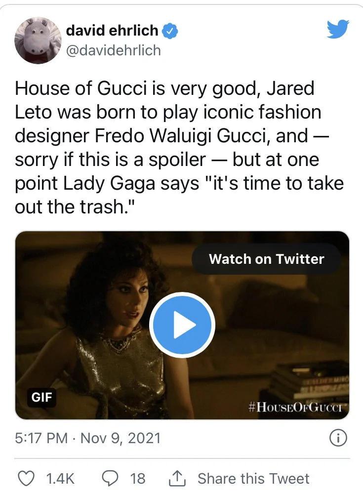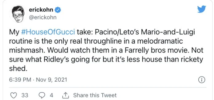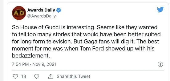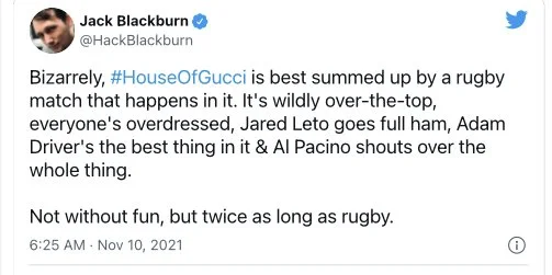 The social media embargo was lifted yesterday evening for Ridley Scott’s “House of Gucci” and, as expected, the reactions are mixed. There’s a scant few positive tweets here and there, and the people who do seem to like it are very self-aware about how silly the whole thing is.