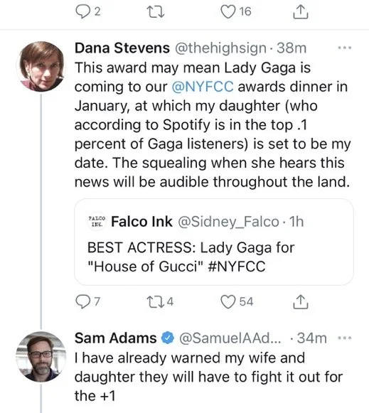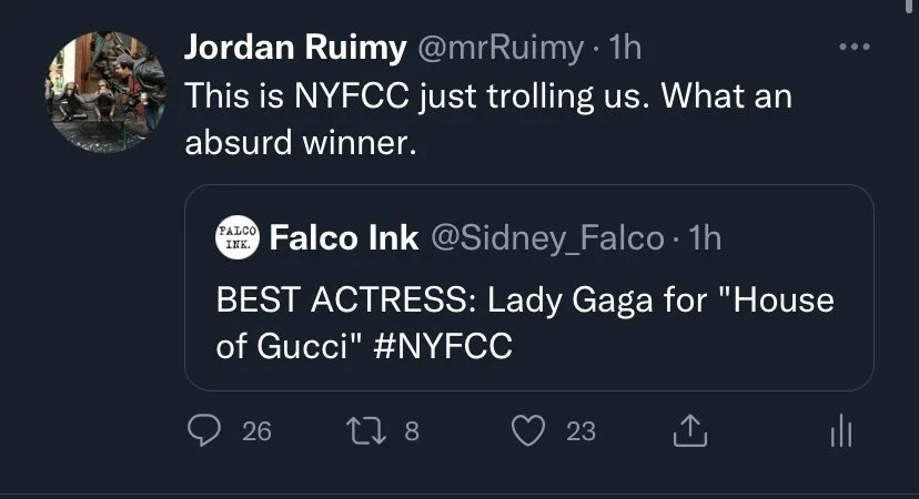 Of course, nothing can cleanse the stench of Lady Gaga winning Best Actress. This was a pure PR move on the part of the New York critics, oh, and a chance for their kids to meet Gaga at the ceremony …
