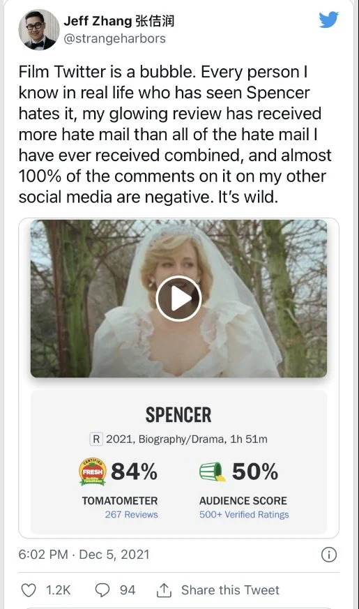 Does this diminish Stewart as an Oscar contender? Kind of? With just $7 million made at the box office, and low audience scores on IMDb and Rotten Tomatoes, this could strip K-Stew of her frontrunner status, especially with likes of Haim, Zegler, Gaga, and Colman climbing up the charts.