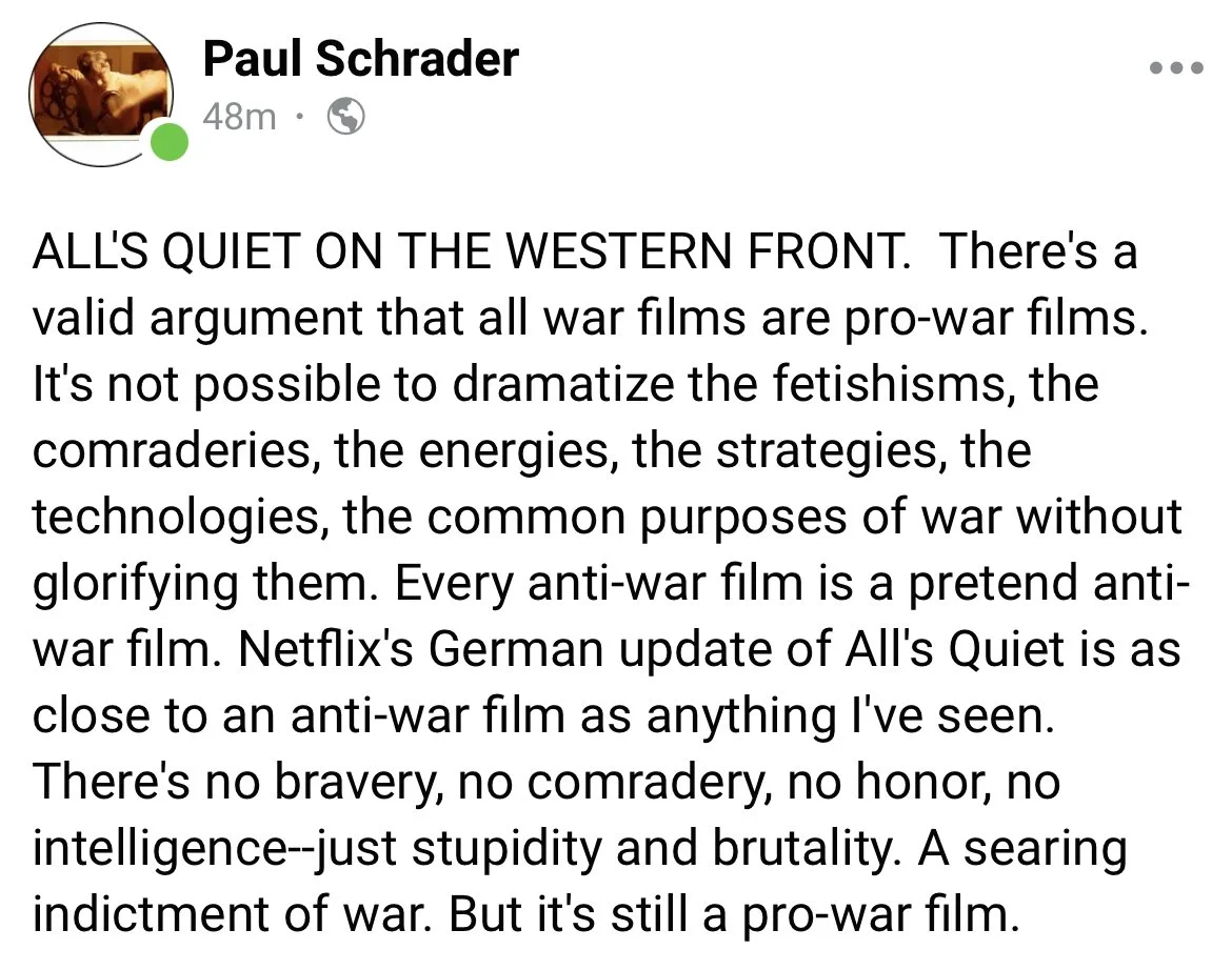 In his latest social media post, Schrader decided to write about Edward Berger’s “All Quiet on the Western Front,” which I reviewed a few weeks ago: