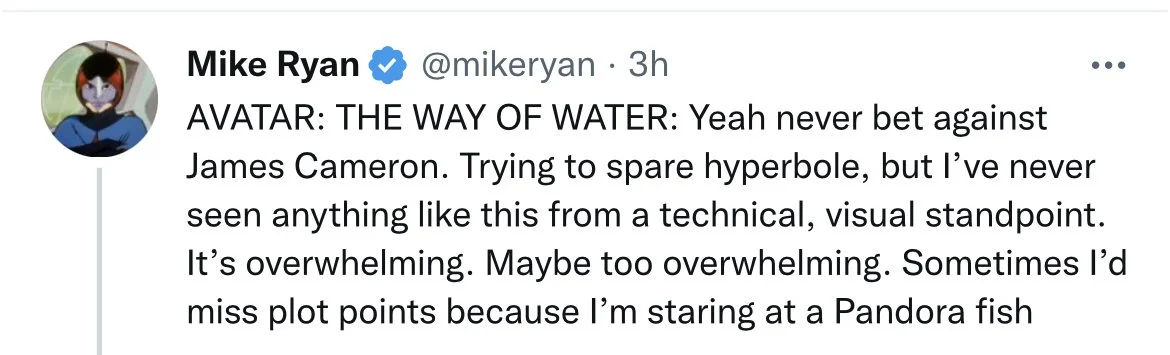 EARLIER: The moment many James Cameron fans on this site have been waiting for has arrived. “Avatar: The Way of Water” screens today at 1pm ET. All 192 minutes of it.