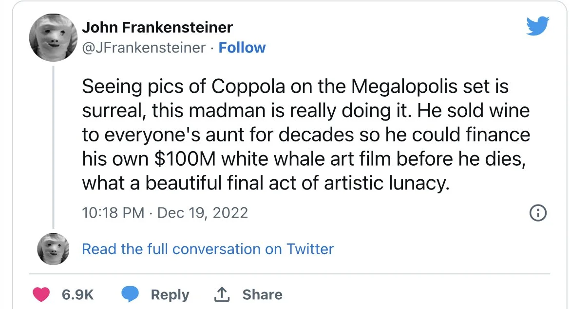 It’s been reported that Coppola will invest $120 million of his own money to make the damn thing The legendary writer-director sold a portion of his wine empire to finance the upcoming epic. Why? Because he damn well can. He probably has money to spare. At least this will give the master TOTAL CREATIVE CONTROL over the whole project.