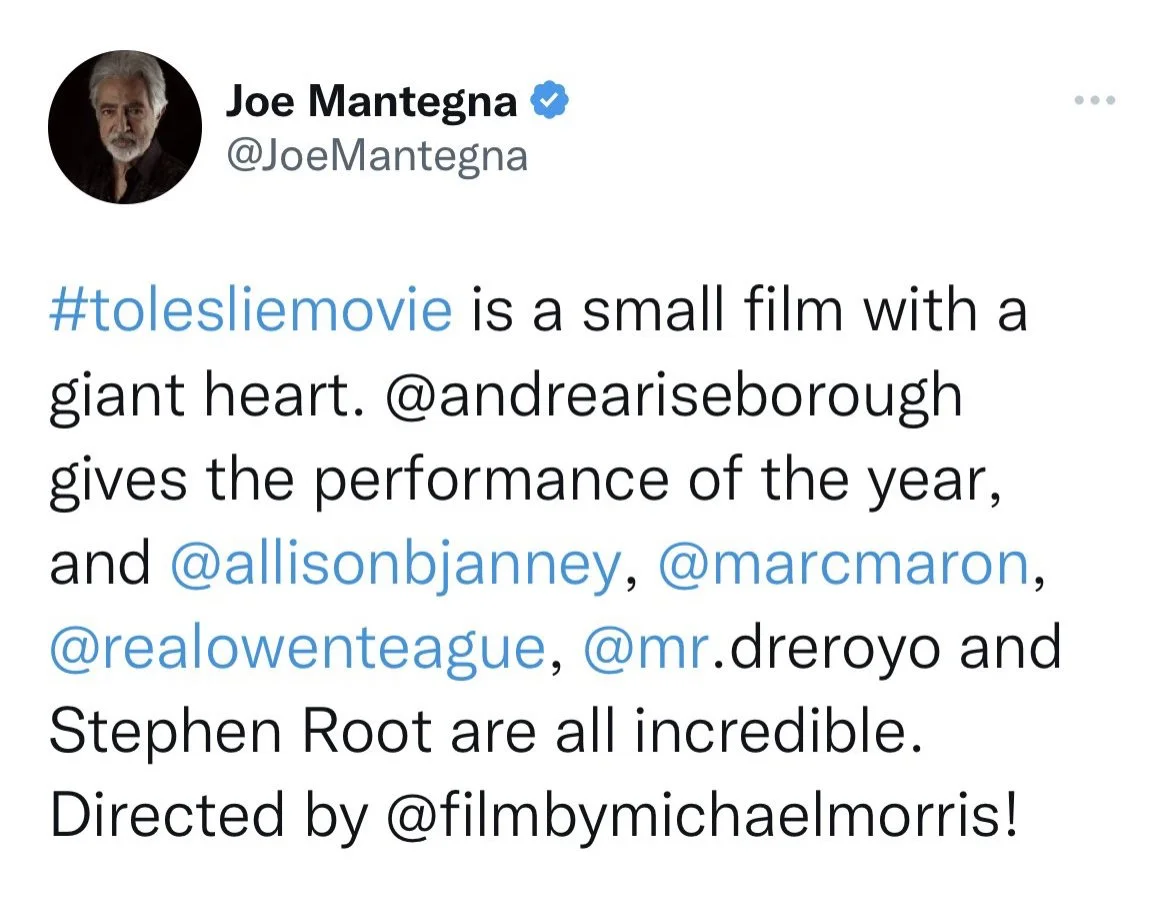 I’ve already stated how I’m fully backing this peculiar Riseborough campaign. However, I need to add something: #tolesliemovie is a small film with a big heart. @andreariseborough gives the performance of the year and @allisonbjanney, @marcmaron, @realowenteague, @andreroyo and Stephen Root are all incredible.