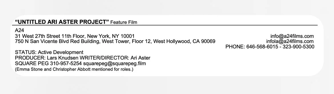 EDIT: Production Weekly has updated the Aster project. It’s still seems to be happening, but now they have Emma Stone and Christopher Abbott as “mentioned for roles”: