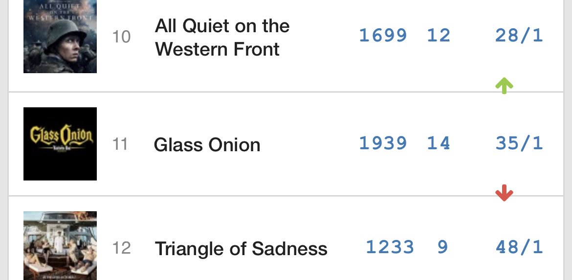 Since late Summer I’ve been saying that Netflix’s top priority for awards season was going to be “Glass Onion,” and they probably, somewhat, still see it as an Oscar player, but ‘All Quiet’ just has more steam going for it right now. Berger’s film has also found a surprisingly big audience on Netflix, and deservedly so, it is a technically accomplished picture.