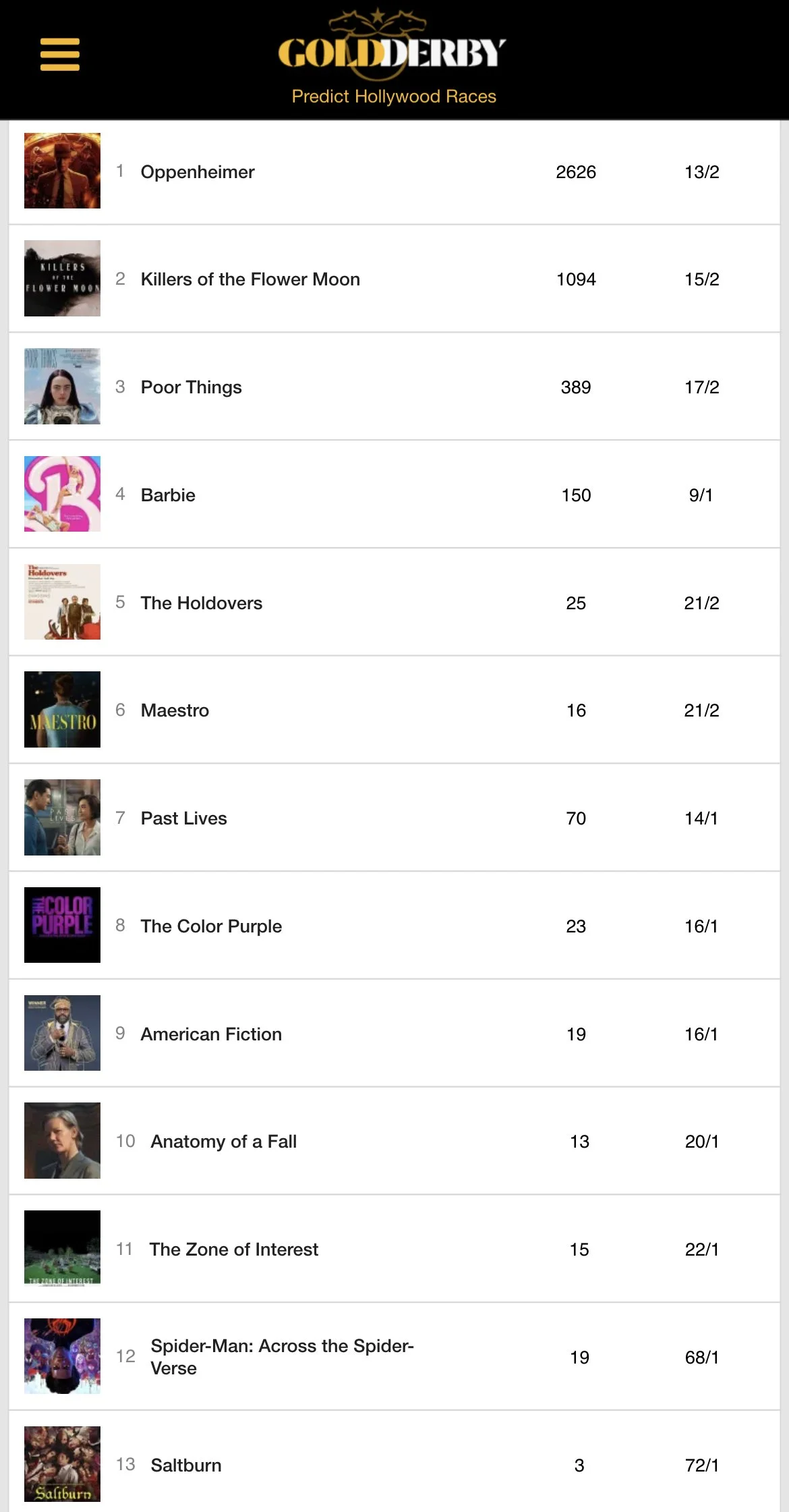 The rest of the “experts” list is fairly predictable and has all of the contenders, so it’s looking like a fairly easy season to predict. From #4-10 you have “Barbie,” “The Holdovers,” “Maestro,” “Past Lives,” “The Color Purple,” “American Fiction” and “Anatomy of a Fall.”