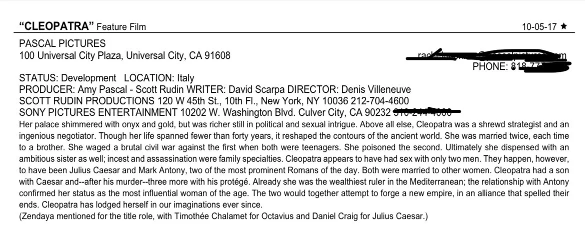 Last night, the latest issue of Production Weekly went online and, lo and behold, “Cleopatra” was posted. There were new plot details and an Italy shoot set for the film. I’ll believe it when I see it, and I’ve contacted Villeneuve’s reps again for comment — no answer as of the publishing of this piece.