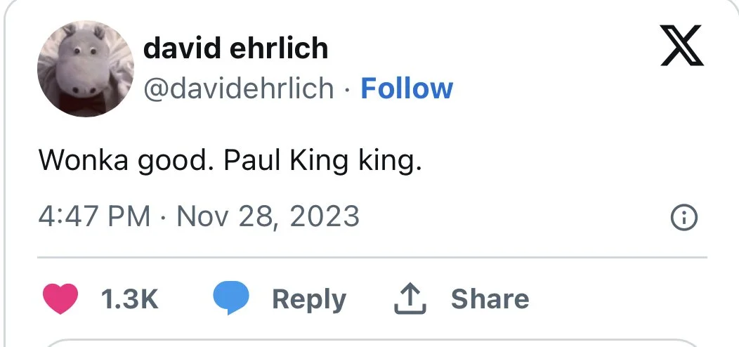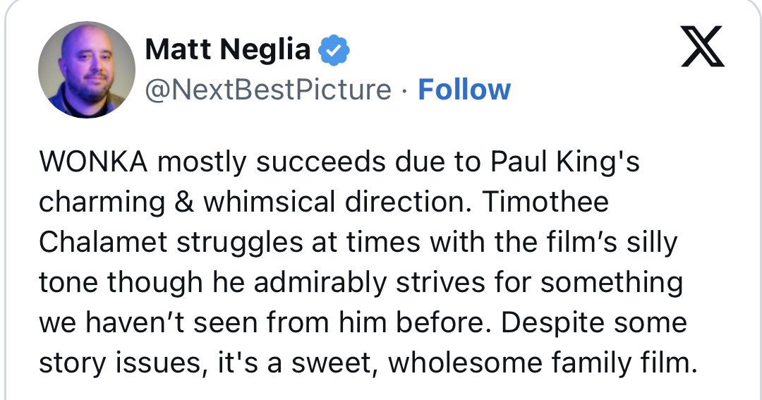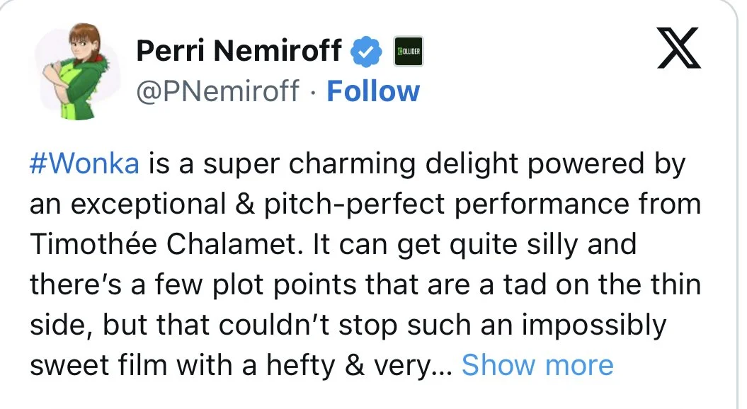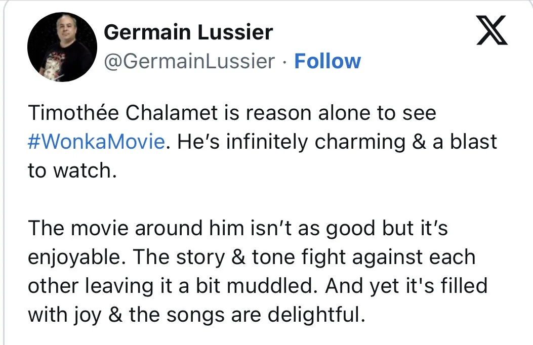 What you’ll get with “Wonka” is something safe and family-friendly. A whimsical tale about a young man who wants to open a chocolate shop. Chalamet’s performance is … I’ll tackle his work here at a later date.