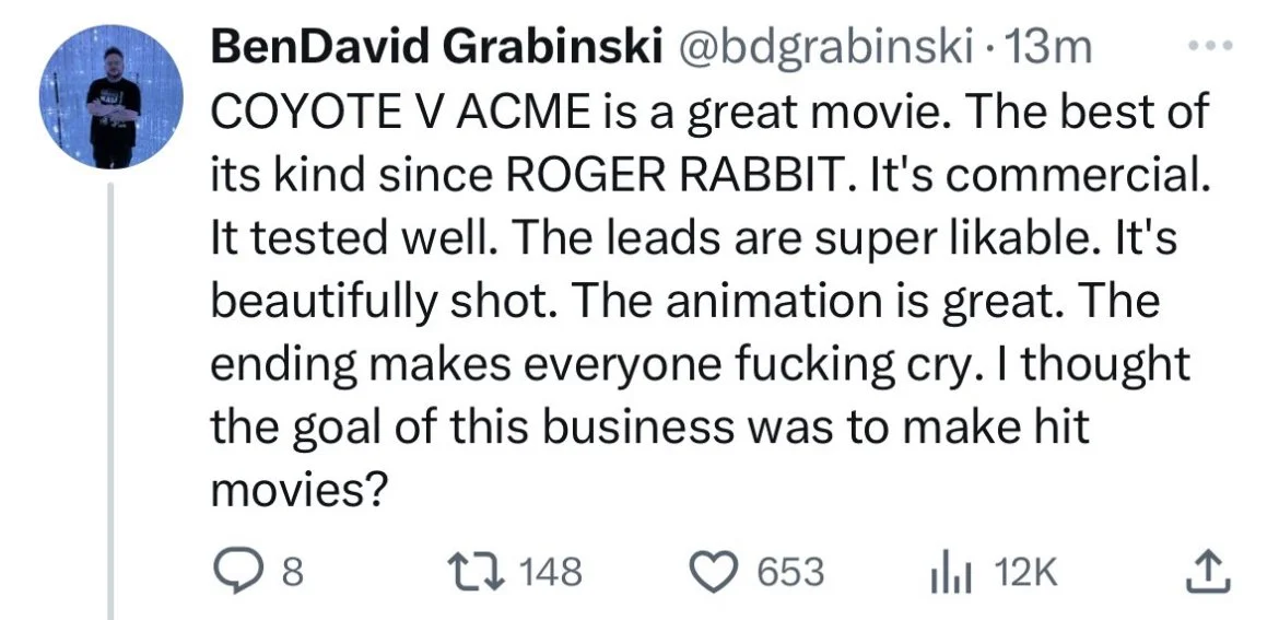Deadline reports that Warners will get a $30 million tax write-off for shelving “Coyote Vs Acme”’ The film is said to have had very good test scores. A WB Motion Picture Group spokesperson said in a statement (via THR):