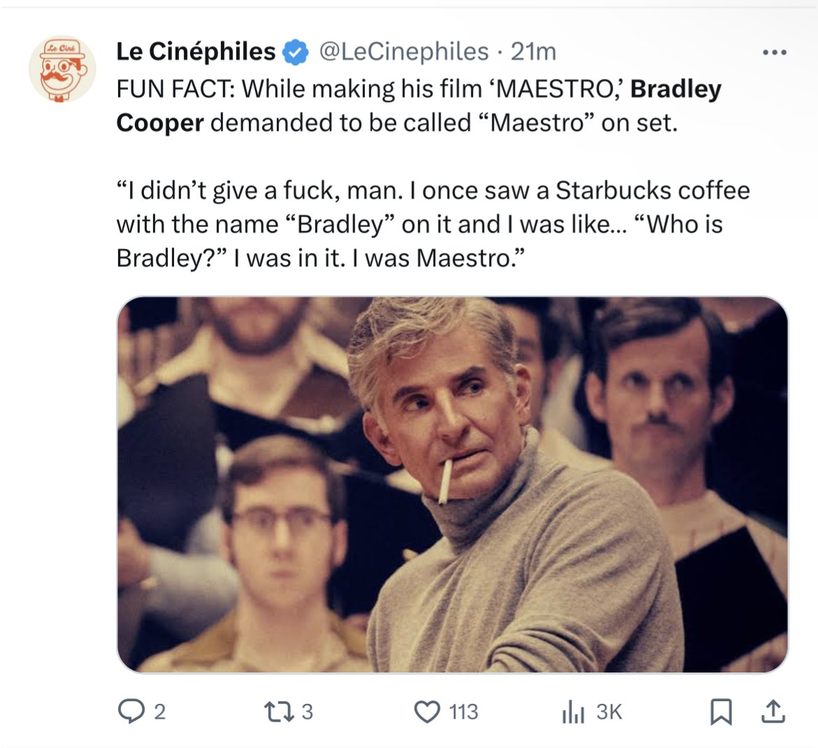 Casting all of this clownery aside, the real issue I had with “Maestro” was that it felt like a film about Bradley Cooper playing Leonard Bernstein. The strenuousness of the whole thing turned me off. Of course, the film has its fans, but I don’t believe we’ll be talking about this film a few years from now. It’s not that memorable, even if it desperately wants to be so.