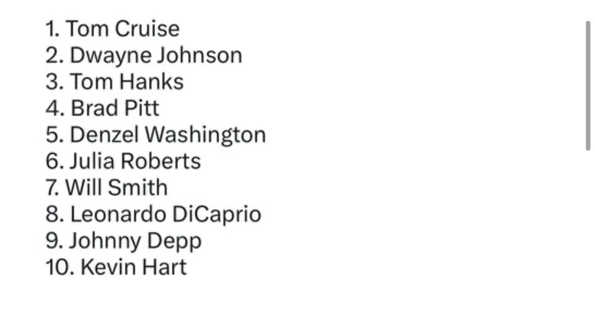 The rest I’m fine with. I’d probably replace Smith and Depp with Keanu Reeves (#11) and Sandra Bullock (#12).