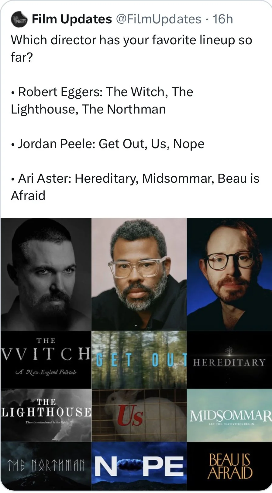 Eggers, Aster and Peele have now directed three films each, they have also built up these hardened fan bases that will go and watch whatever film they do next. Sadly, we’ve been seeing some cracks in the dam, fans have their limits, Aster‘s lacklustre box-office performance with “Beau is Afraid” is proof of that.