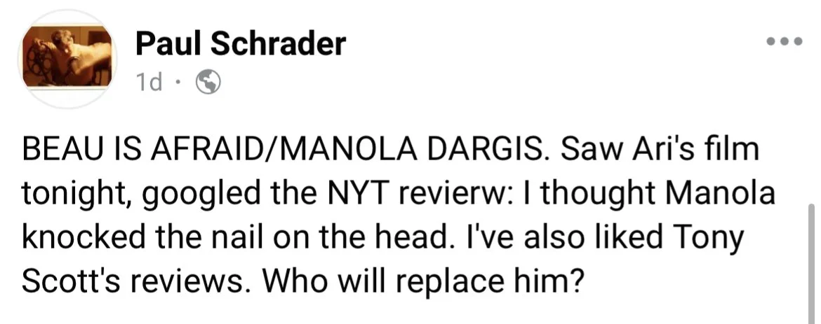 I thought Schrader was gagged by Magnolia Pictures in posting anything on social media? Regardless, he’s still not giving us his own thoughts on “Beau is Afraid,” just shadowing behind Manhola Dargis’ NYT review.