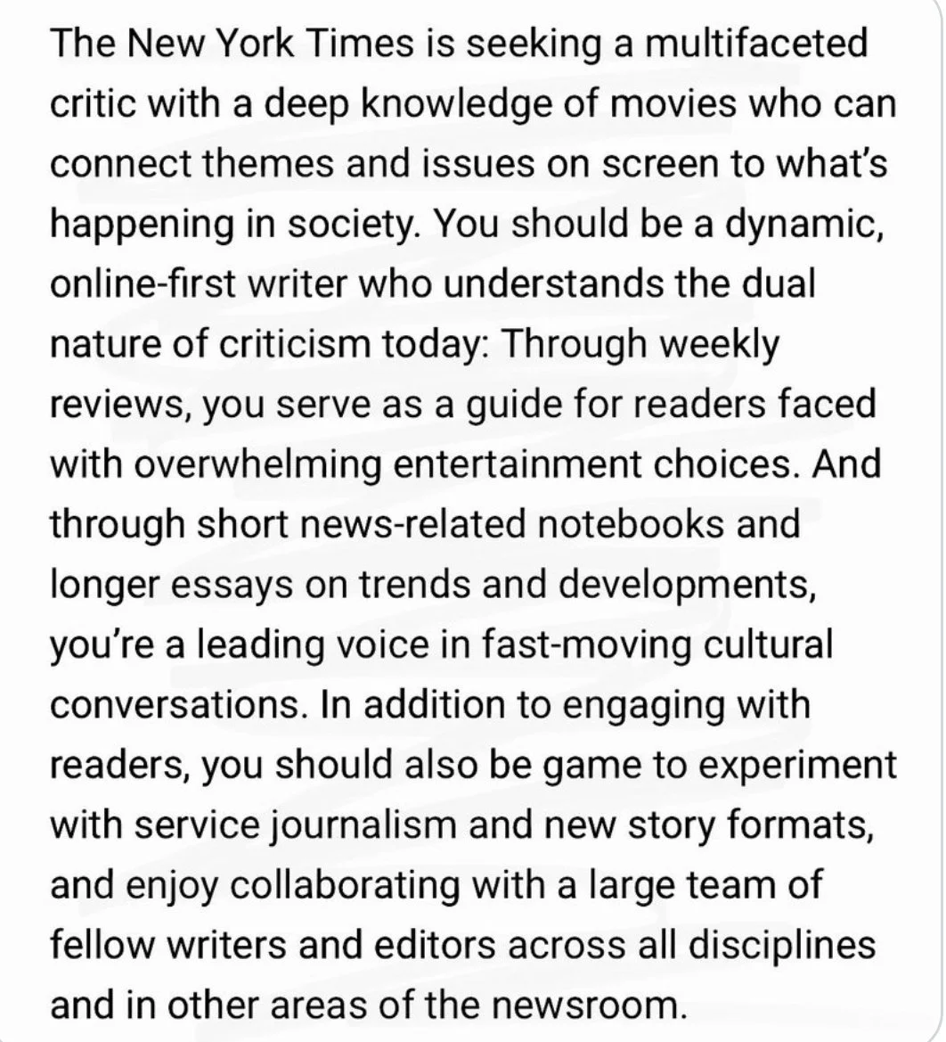 They’re looking for a person who can “connect themes and issues on screen to what’s happening in society.” So, basically, they want a film critic that values culture over art? Sounds like the Times.