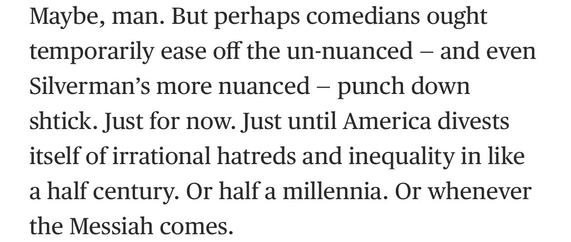 Free speech purists and libertarians might respond to this five-step program by fulminating: Voluntary self-censorship! Slippery slope! Isn’t art about liberty, man? Maybe, man. But perhaps comedians ought temporarily ease off the un-nuanced — and even [Sarah] Silverman’s more nuanced — punch down shtick. Just for now. Just until America divests itself of irrational hatreds and inequality in like a half century. Or half a millennia. Or whenever the Messiah comes.