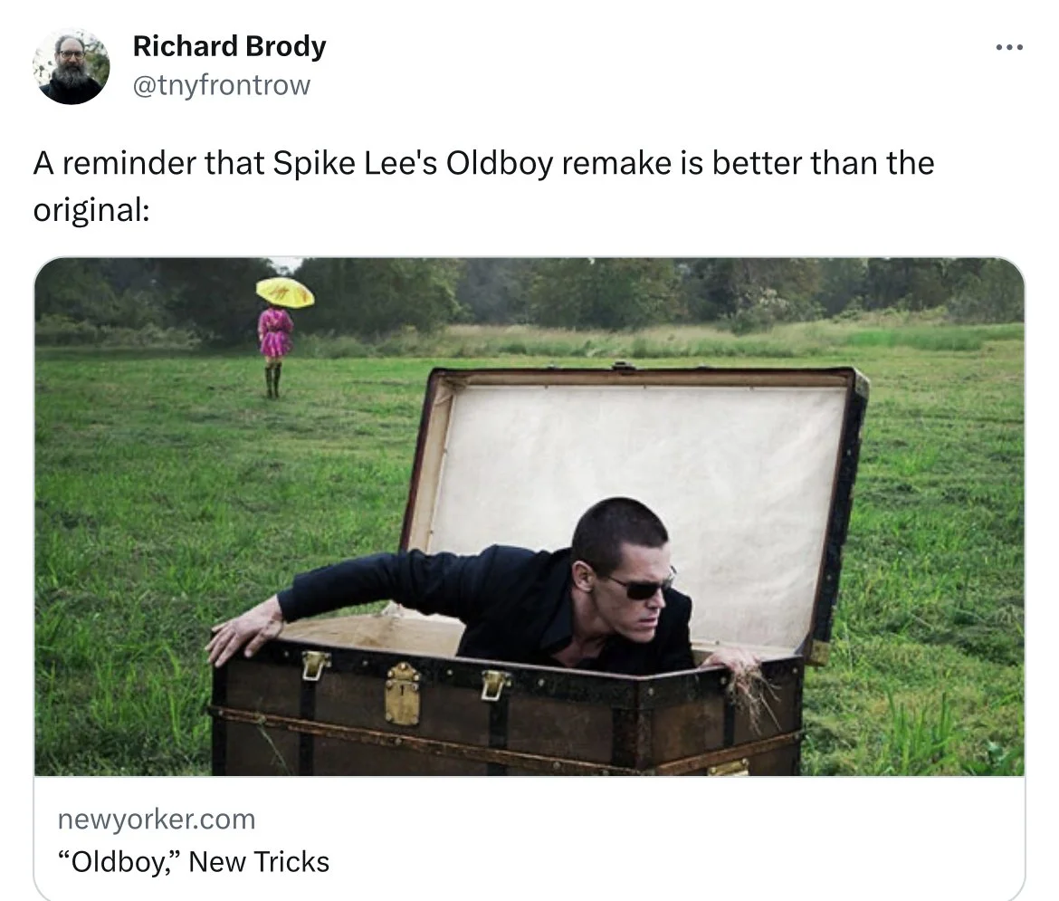 Spike Lee messily remade “Oldboy” in 2013, failing to capture the excitement of the original. Most critics agreed. Although, for some reason, The New Yorker’s Richard Brody still believes that the remake is better than the original.