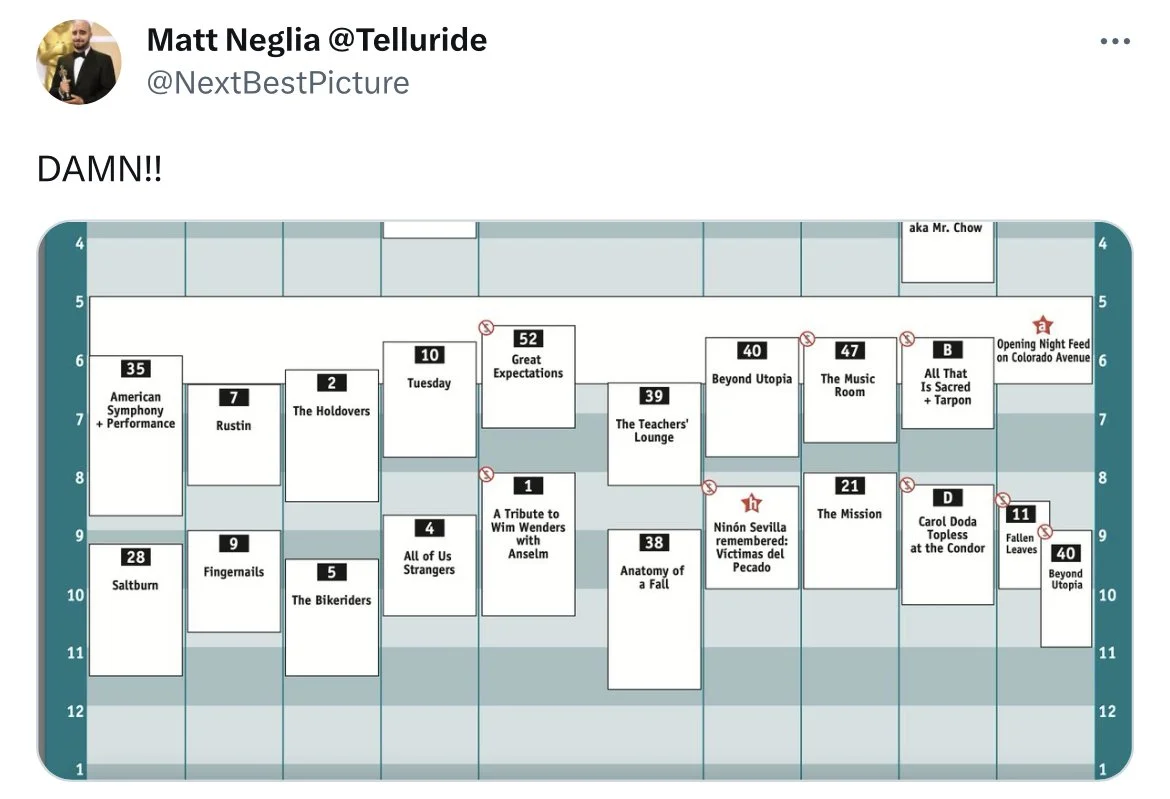 UPDATE: Next Best Picture’s Matt Neglia just posted tomorrow’s screening schedule and attendees will have to decide between watching Saltburn, The Bikeriders, and All Of Us Strangers. Good luck.