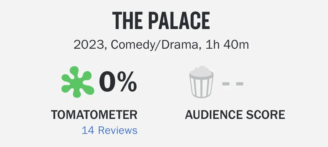 Roman Polanski’s “The Palace” still sits at 0% on Rotten Tomatoes, based on 14 reviews. Critics really seem to hate this one.