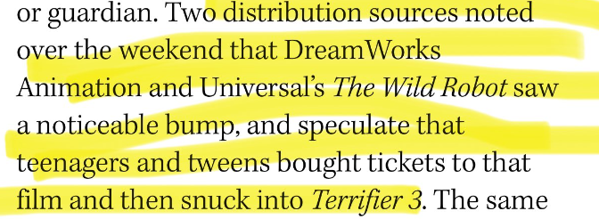 The trade’s sources do note that over the weekend, Universal’s “The Wild Robot” had a noticeable and unusual bump in tickets sold and speculate that teenagers probably bought tickets to ‘Wild Robot’ and then snuck into “Terrifier 3.” The trend continued on Monday’s holiday.