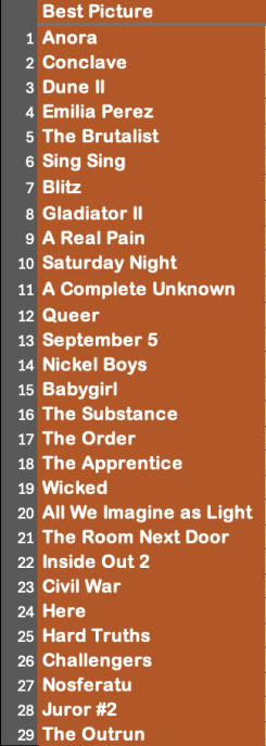 My personal 10 predicted nominees currently are (1) Anora (2) Conclave (3) The Brutalist (4) Emilia Perez (5) Dune: Part II (6) Sing Sing (7) A Real Pain (8) Gladiator II (9) Nickel Boys (10) Saturday Night