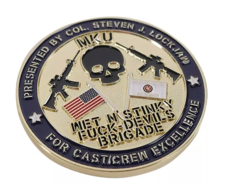 One of the sides has “A Paul Thomas Anderson Motion Picture & Ballroom Extravaganza” stamped on it. The second coin has “Presented by Col. Steven J. Lockjaw,” “MKU,” and “Wet n’ Stinky Fuck Devil’s Brigade.”