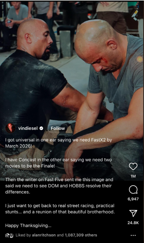 On Thursday morning, Diesel gave an update on “Fast X: Part 2.” There’s been very little news about the status of the sequel since ‘Fast X’ opened in theaters in May 2023, and ended on a cliffhanger. It didn’t help that co-star Tyrese Gibson recently pondered whether the film would ever get made.