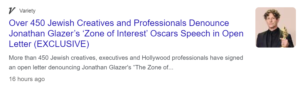 One look at the list of Jewish “creatives” and “professionals” denouncing Jonathan Glazer, and the names on the list are Eli Roth, Jennifer Jason Leigh, Rod Lurie, Debra Messing, Ari Arad, and Amy Pascal. Where’s Steven Spielberg?
