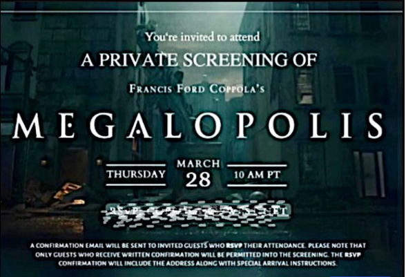 Here’s something that was sent by a filmmaker invited to a private screening of Coppola’s upcoming epic, taking place next week. No mention of it being a “work in progress.” The film’s been in post production since March 2023, it’s time to unveil it.