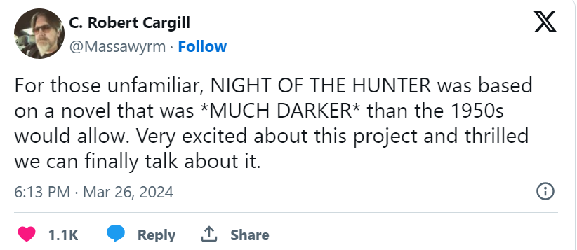 Cargill, who also co-wrote “Sinister” and “Black Phone” with Derrickson, knew that backlash would occur after the announcement of a ‘Night of the Hunter’ remake, so he took to Twitter to explain that he believes ‘Night of the Hunter’ deserved to be remade with a darker tone to the original.