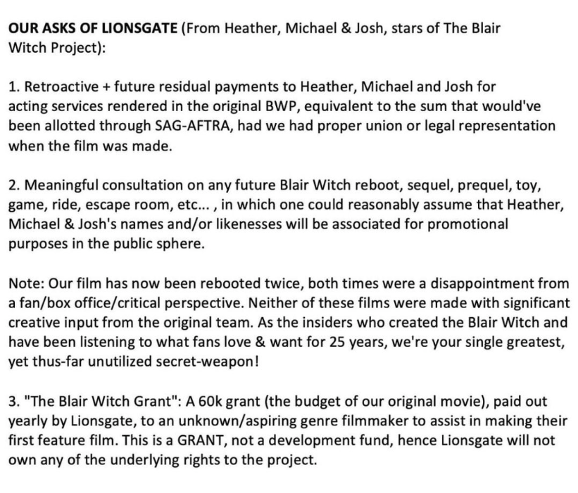 Now, ahead of Blair Witch’s 25th theatrical anniversary, in July, the original cast is demanding that they directly benefit from the film. On Saturday, actors Heather Donahue, Michael Williams, and Joshua Leonard released a joint statement, directed at Lionsgate, asking for retroactive and future residual payments for their roles in the original film.