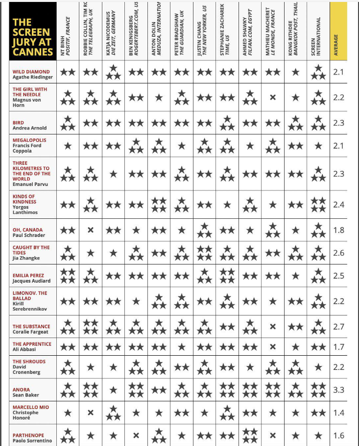 This year’s grids have been wild to follow. As of this moment, Le Film Francais’ batch of critics seem to be leaning more towards Jacques Audiard’s “Emilia Perez,” or even “Megalopolis,” as their consensus favorite. Whereas Screen International’s grid has Sean Baker’s “Anora” in the lead with a 3.3 score — the only film from this year’s competition to crack the 3 and above mark.