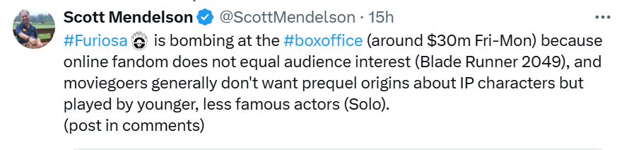 Puck’s Scott Mendelson is sounding the alarm on the $170M budgeted “Furiosa,” which I’ve been doing since last week. Its box-office numbers are a catastrophe.