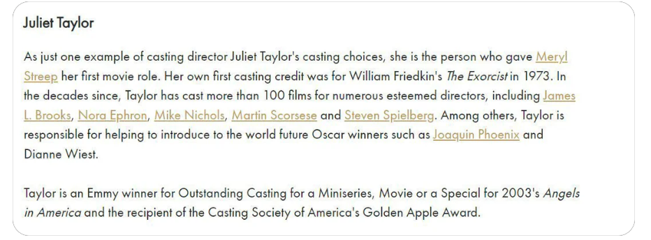 Taylor is best known as the genius casting director of Allen’s most iconic films; she’s worked on a whopping 43 of his films. That’s practically half the credits in her filmography. She’s cast every one of his films from 1975 until her retirement in 2017.