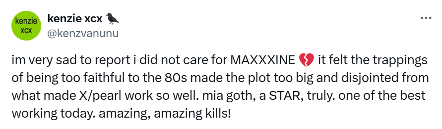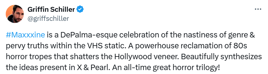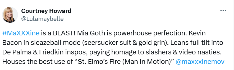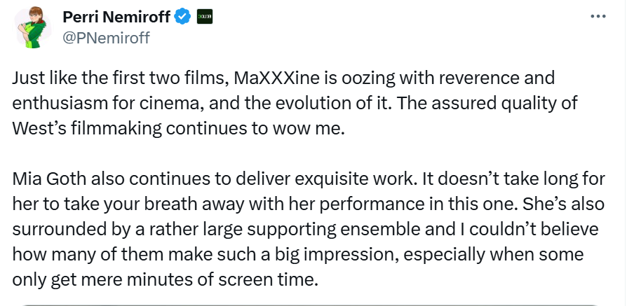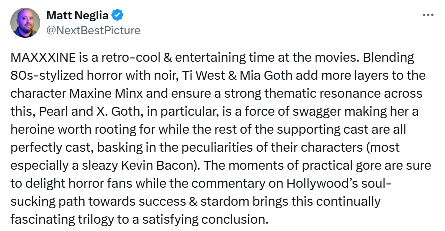 I’ve only posted reactions from writers I recognize. They’re almost all positive, but I will say that, based on the people I’ve personally spoken to, reviews might be a little more mixed for “MaXXXine” than they were for the previous two films in West’s trilogy (“Pearl” and “X”).