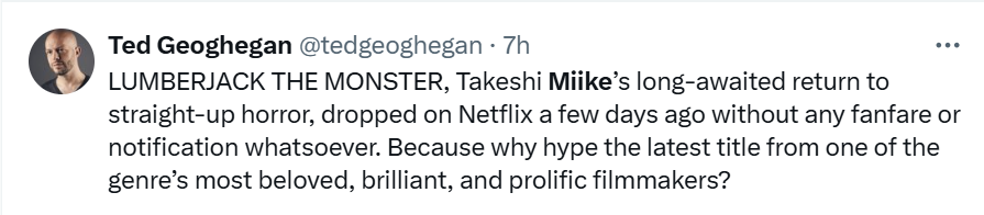 “Lumberjack the Monster,” the new film by Miike, arrived on Netflix over the weekend. It’s his first horror movie in over a decade — a genre which he mastered in his greatest works. Netflix didn’t even tell press that they were releasing the film. The only reason folks caught on that a new had Miike dropped was via social media posts.