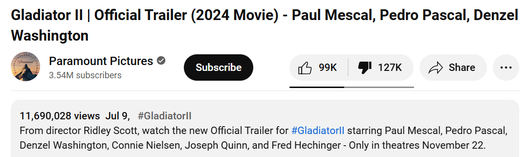 The like-to-dislike ratio for the “Gladiator II” trailer is wild.