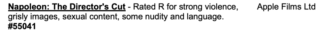 Ridley Scott's “Napoleon: The Director's Cut” is potentially coming very soon. It's just been rated R for strong violence, grisly images, sexual content, some nudity and language. This signifies clear intent on the part of Apple TV to make it available on their platform.