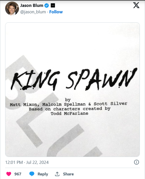 Blum and McFarlane have shared a photo showing the title page for a script titled “King Spawn”, written by Matt Mixon, Malcolm Spellman (“Falcon and the Winter Soldier”) & Scott Silver (“Joker”). Last year, Blum stated that he was eyeing a 2025 release for the film.