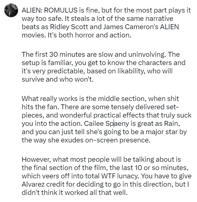 The review embargo for Fede Alvarez’s “Alien: Romulus” will be lifted tomorrow. However, social media reactions are allowed. Here’s what I posted on X. More to come …