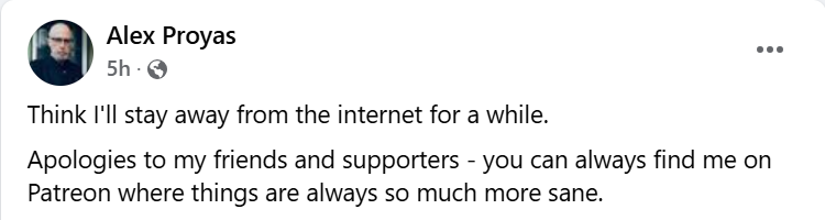A few days later, after probably realizing how relentless he’s been towards the film, and no doubt spurred on by his publicist’s advice, Proyas announced that he was taking a break from FB for the time being.