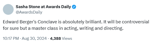The supporting cast in “Conclave” is said to be very strong, including John Lithgow, Stanley Tucci and Isabella Rossellini. Suffice to say, Focus, who is releasing “Conclave” theatrically on November 1, might have a major player here.